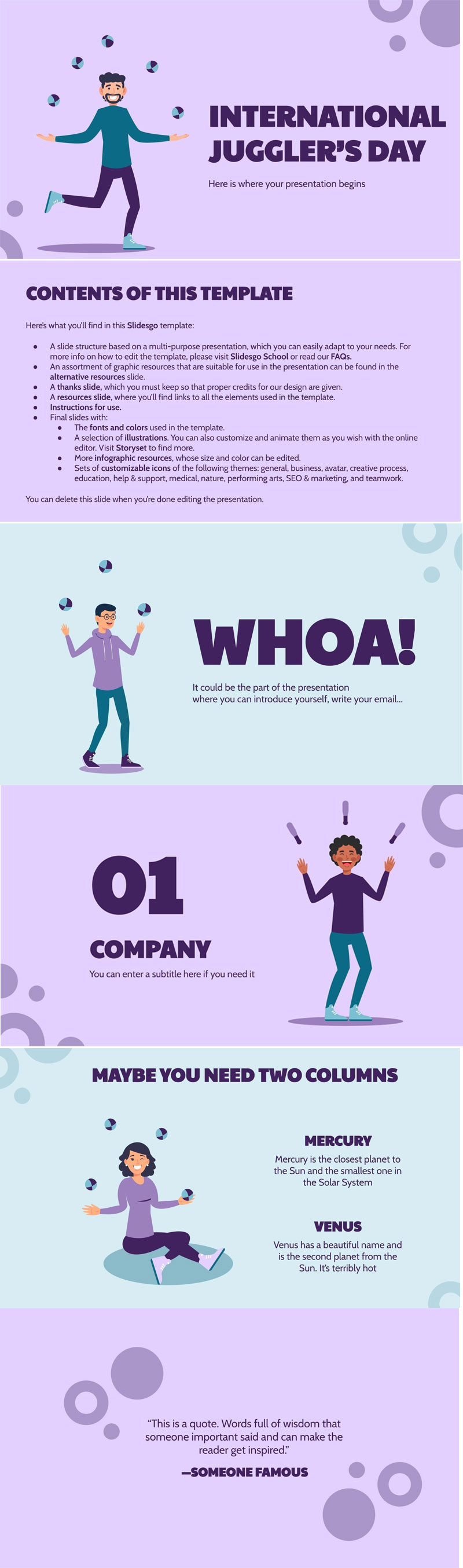 你喜欢玩杂耍吗?也许您可以准备一份包含提示和技巧的演示文稿,以庆祝 4 月 18 日庆祝的国际杂耍日。为了帮助您,我们建议您使用此模板,您可以根据自己的喜好进行编辑。它有紫色和蓝色的背景,还有许多人物杂耍的插图,给人一种有趣的感觉。图表、信息图表和表格将帮助您传达所需的信息。在地图上,您可以添加有趣的事实并将它们放在相应的国家/地区。