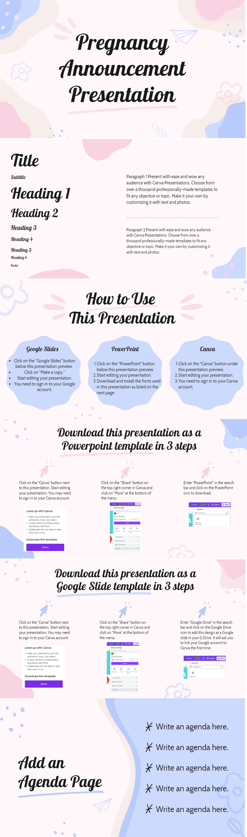 有什么要特别宣布的吗?自定义这些花卉怀孕公告幻灯片,以您的方式庆祝重大新闻。这些幻灯片经过专业设计和完全可定制,非常适合用作PPT模板。保持布局不变,或通过重新排列文本框并选择您自己的配色方案和字体组合来更改布局。添加图像、图标、照片和其他图形。查看幻灯片开头的“操作方法”幻灯片,了解如何将这些幻灯片用作 Google 幻灯片主题、PowerPoint 模板或 Canva 主题。 此PPT模板具有以下特点: 25 多张现成的幻灯片,可根据需要进行自定义 数百种图表、框架、线条和形状可供选择 每张幻灯片的便捷动画和过渡功能 以多种格式轻松下载或共享 在 Canva,您可以获得更多福利: 一个简单的拖放工具来帮助您添加图形 令人惊叹的图标和元素库可供选择 可搜索的视频、配乐和其他音频剪辑 数以百万计的专业设计的图像和照片 预先录制的谈话演示工具可帮助您练习 与朋友、同事和家人轻松协作