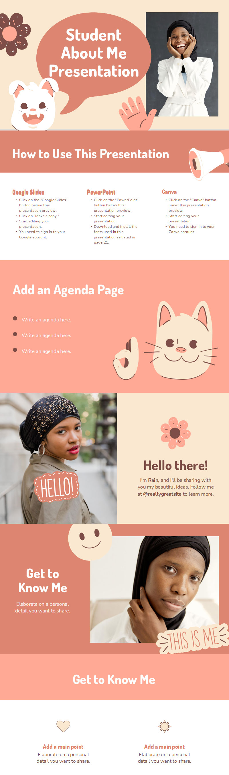 这款 Student About Me 模板采用米色、粉色和棕色,友好且平易近人。这些幻灯片像剪贴簿一样设计,有足够的空间放置图像、插图、照片和文本。您可以使用现成的、经过专业设计的布局,也可以自行修改并更改字体、配色方案等。您会找到一个方便的图标和元素资源页面、时间表和爱好的提示以及在 Google 幻灯片、PowerPoint 或 Canva 中使用此模板的操作方法页面。另一张幻灯片向您展示了如何使用链接转到模板中的不同幻灯片。 [](https://drfs.ctcontents.com/file/18725144/733206747/6a52d7/web%E5%89%8D%E7%AB%AF02/PPT%E6%A8%A1%E6%9D%BF/2022112414.jpg)