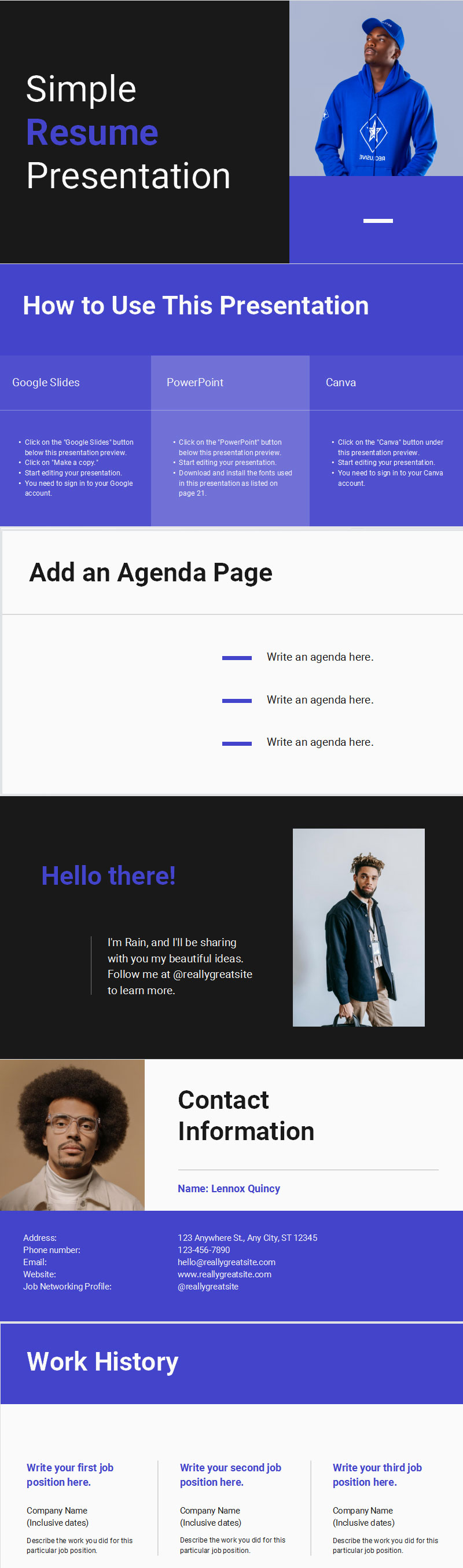 这些简单的简历幻灯片简单而时尚,可让您分享您的工作经历、教育背景、技能和熟练程度、人物推荐、工作时间表、联系信息等。与使用典型的简历模板相比,您可以添加更多内容,从图表和统计数据到反映您职业目标的主题和想法。从图标和元素资源页面中汲取灵感,获得一些额外的天赋。在每张幻灯片上试验图像与文本的比例。首先,查看幻灯片开头的方便的“操作方法”幻灯片,了解如何将此简历模板与 Google 幻灯片、PowerPoint 或 Canva 结合使用 [](https://drfs.ctcontents.com/file/18725144/733206752/129fa8/web%E5%89%8D%E7%AB%AF02/PPT%E6%A8%A1%E6%9D%BF/2022112415.jpg)