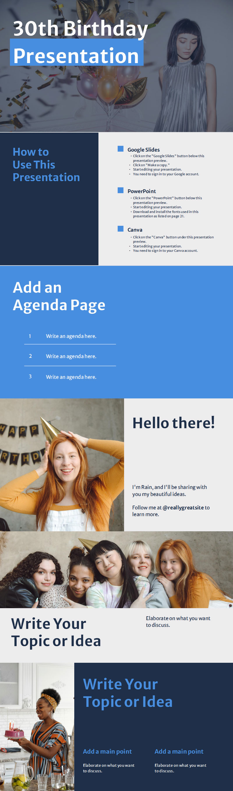 这个 30岁生日幻灯片采用蓝色和灰色配色方案,看起来更成熟。使用方法幻灯片开始您的设计过程,这样您就可以使用此模板进行生日快乐 PPT模板设计。使用您自己的图片和文字,或使用已有的图片和文字,让幻灯片的其余部分栩栩如生。有空间可以添加日程表或时间表、派对宾客名单、鼓舞人心的名言等等。更改背景颜色、添加元素和图标、重新排列幻灯片或轻松上传您自己的照片和图像以获得更个性化的风格。