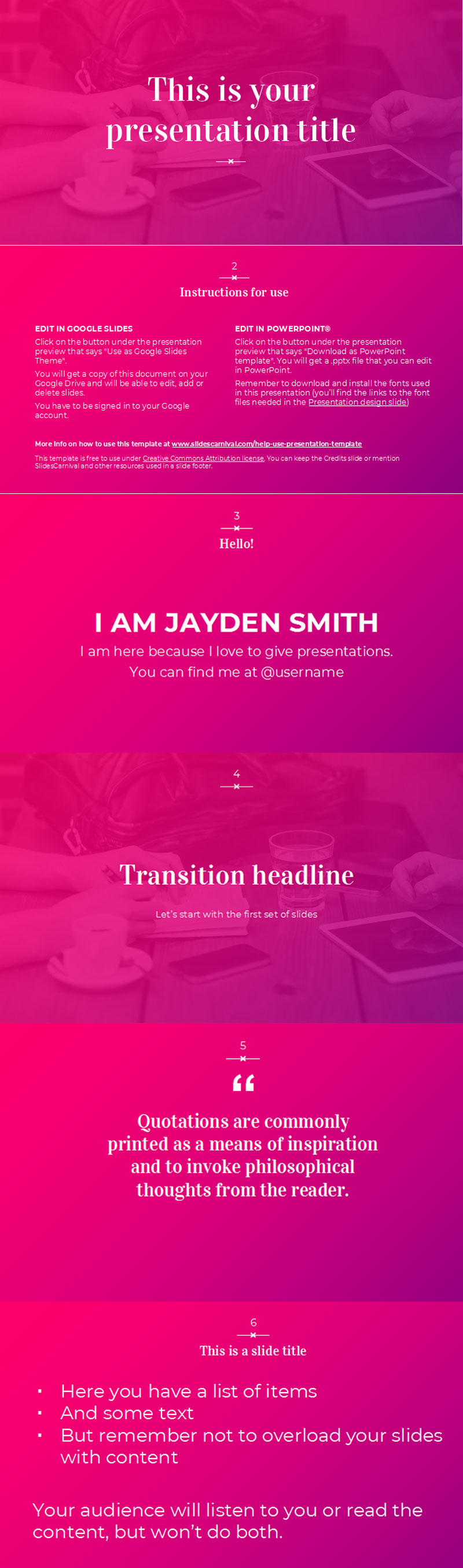 Rosalind 免费ppt模板既优雅又现代。它具有充满活力的紫红色到紫色渐变背景,但如果您喜欢使用其他调色板,也可以包括其他渐变。白色边框和衬线排版传达出优雅的外观和感觉,同时渐变背景使其清新现代。凭借积极而充满活力的内容,结果会让您的观众大吃一惊,并且不会让任何人无动于衷。用它来谈论几乎任何话题,尤其是当你的会议或会议是关于营销、广告或新趋势的时候。