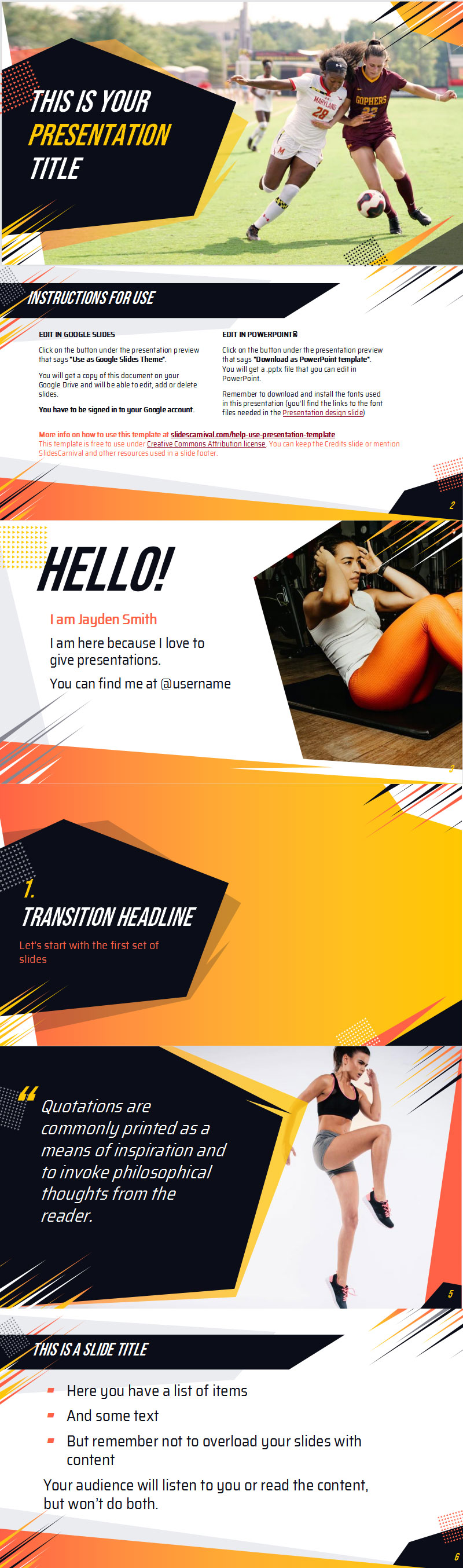 使用这个充满活力和力量的免费ppt模板激发您的听众。这种设计的几何形状、斜线和鲜艳的色彩使每个布局看起来都在运动。您可以通过更改主题调色板在几秒钟内使其适应您的企业形象!如果您要谈论体育,这些幻灯片是您的最佳选择,但它们也适合音乐、舞蹈和视频游戏主题。