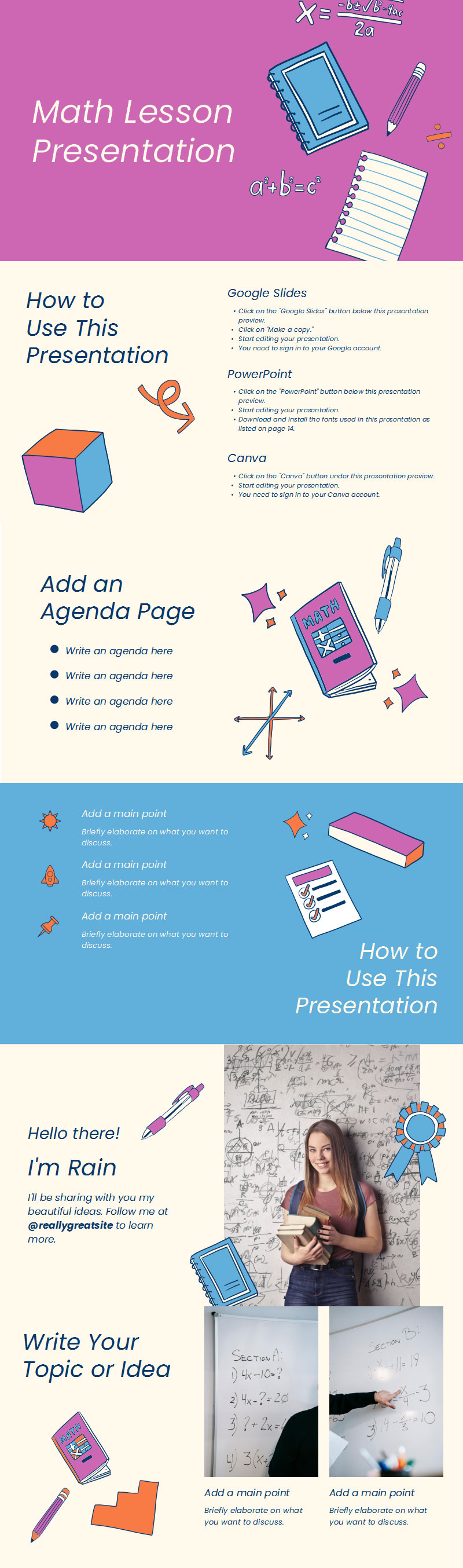 这个欢快的数学课模板有紫色、蓝色和橙色。这些幻灯片包含奇特的数学主题涂鸦和插图,包含您计划有效课程所需的一切。填写时间表和议程,列出主要主题和概念,添加图表和图形,并在完全可定制的幻灯片上展示您的要点。保持配色方案不变或分支。坚持使用 Poppins 字体样式或选择您自己的字体样式。查看元素和图标资源页面以获得更多想法。在甲板的开头,您可以学习如何将其用作数学 PowerPoint 模板、数学主题的 Google 幻灯片或 Canva 设计。
