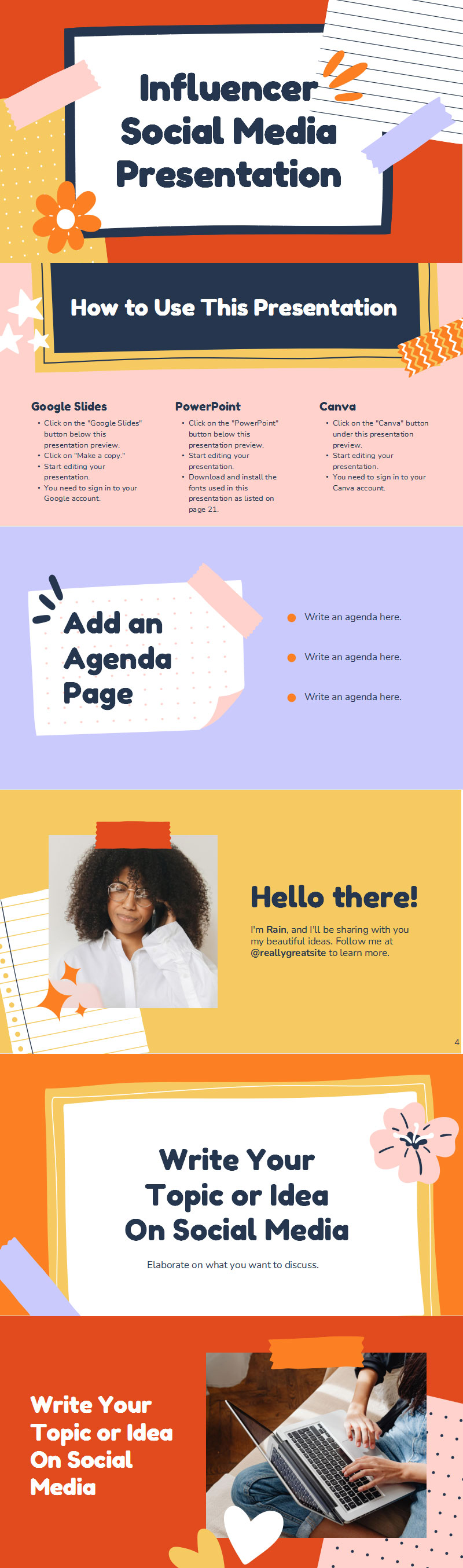 这个有影响力的社交媒体模板充满活力和开朗,拥有您与忠实观众分享您的内幕知识所需的一切。从议程开始,列出社交媒体主题或想法,添加照片和标题,共享统计数据,包括图表和图形,并填写团队成员页面。您始终可以自定义幻灯片,因此可以随意重新排列布局、添加或删除页面或更改配色方案和字体组合。