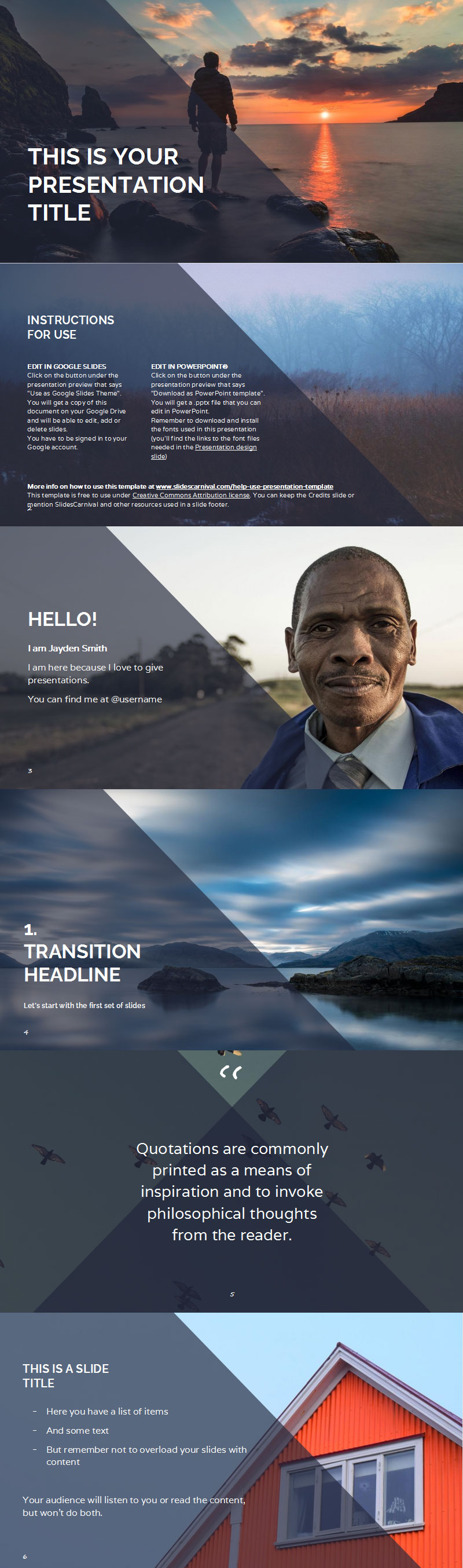 只需使用此免费摄影ppt模板,即可通过ppt幻灯片演示文稿激发您的观众。依靠背景照片来讲述视觉故事,并记住上传您自己的照片以匹配您的演示主题。倾斜的形状使设计充满活力和现代感。无论您需要发表专业演讲还是创意演讲,这个主题都将帮助您讲述一个鼓舞人心的故事。