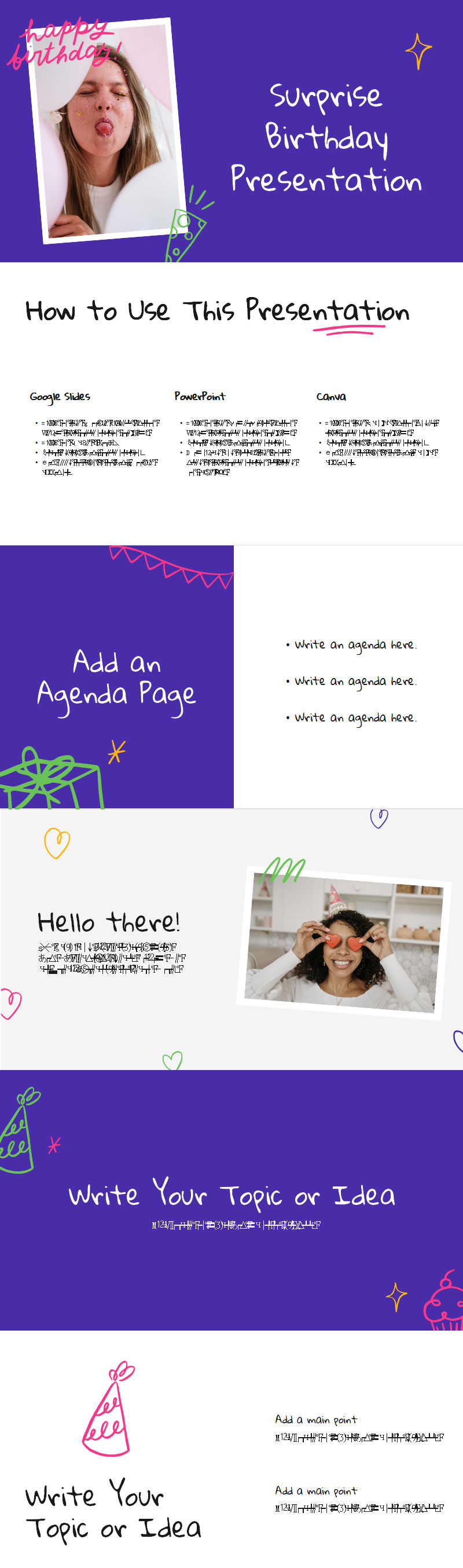 这个充满活力的模板包含您策划难忘的21岁生日派对或记录并分享您的成功所需的一切。从 How-To 幻灯片开始,它将帮助您将设计转化为生日快乐、生日PPT模板或 Canva 生日设计。接下来,制定一个议程;讨论的话题和想法;鼓舞人心的名言和照片说明;团队成员添加;以及时间表和图表。您会找到元素和图标资源页面来帮助您装饰幻灯片。好消息是所有幻灯片都是完全可定制的,这意味着您可以按原样使用它们或完全更改它们。