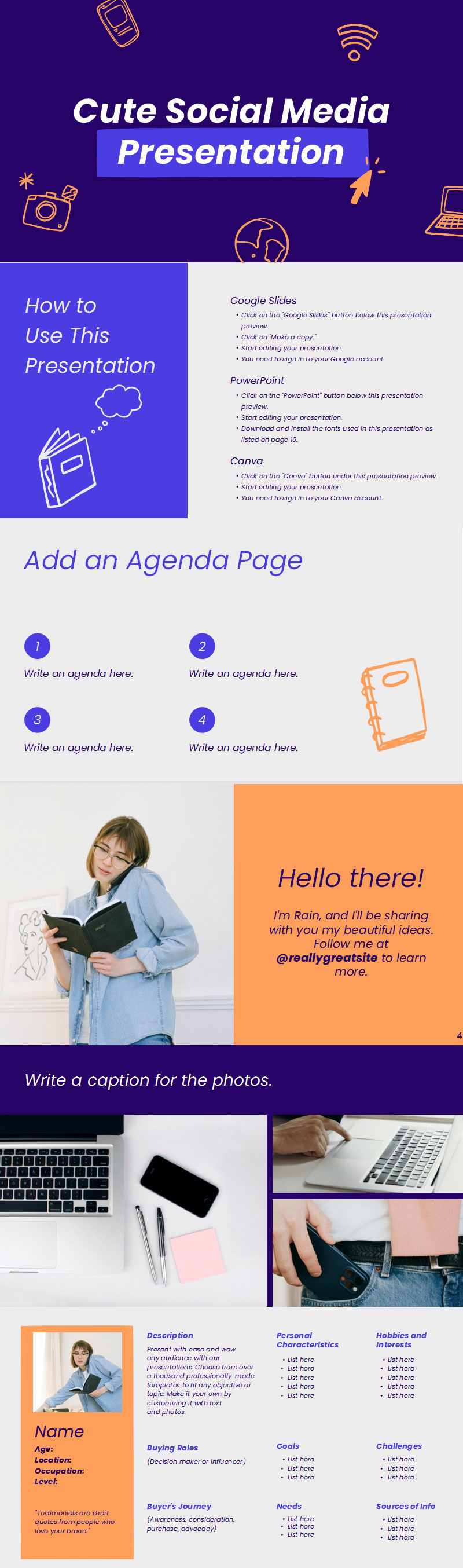 这个紫色和橙色的可爱社交媒体模板现成且经过专业设计,可以为您的所有创意提供所需的视觉触感。填写时间线和议程页面,添加统计数据和图表,展示用户个人资料并分享想法和主题。添加客户推荐,以展示您如何帮助他人提升他们的社交影响力。上传图像、视频和照片。查阅方便的图标和元素资源页面以获得一些额外的天赋。