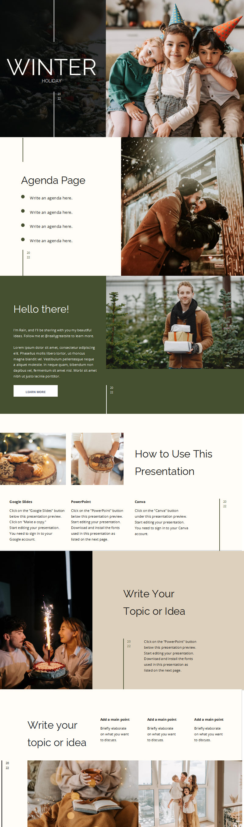 使用这个冬季假期模板为冬季带来一点温暖和欢呼,非常适合用作ppt模板。使用您自己的照片自定义这些专业设计的幻灯片,或从免费图像、图标、插图和其他图形库中进行选择。使用方便的图标和元素资源页面获取灵感。重新排列文本框或保持布局不变。