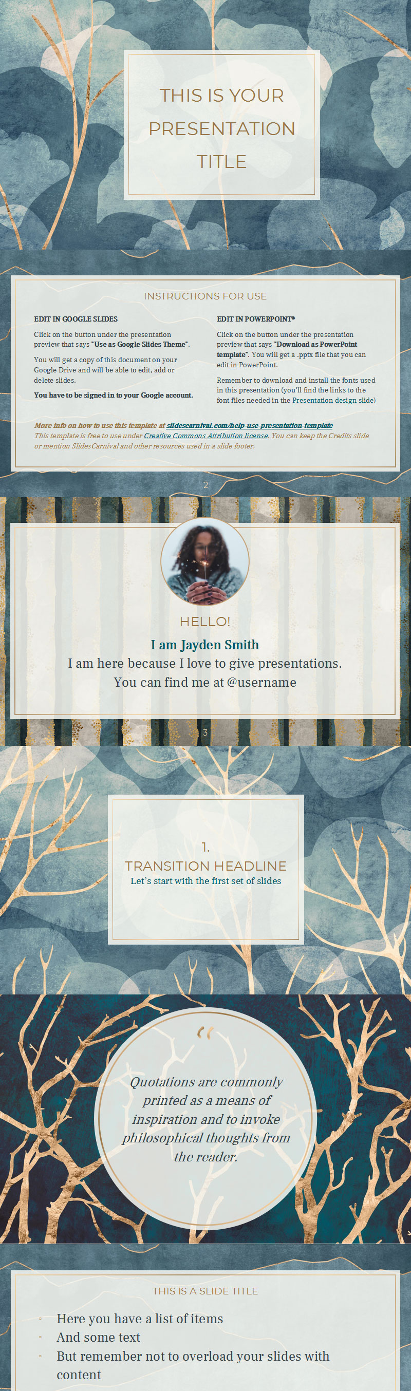 使用此免费ppt模板,让您的观众沉浸在蓝色和金色自然的大气世界中。这种设计具有纹理背景、精致的叶子图案和令人回味的冬季色调。结果既优雅又华丽,非常适合您想要传达奢华和对细节的关注的演示
