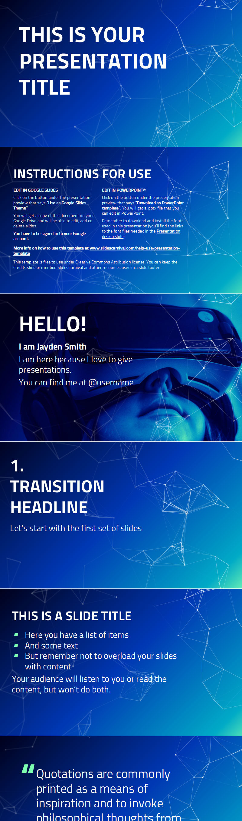 如果您需要创建关于互联网、区块链、机器学习、网络安全、云计算或其他技术相关主题的演示文稿,那么这个免费的 ppt幻灯片主题非常适合这项工作。这种设计以连接线和点的背景为特色,传达了科技的外观和感觉。您可以轻松地将背景自定义为任何颜色、渐变或图像,使您的演示文稿个性化且独一无二。此外,该主题带有几个可编辑的布局,可以轻松填充您自己的内容以快速生成脱颖而出的专业演示文稿