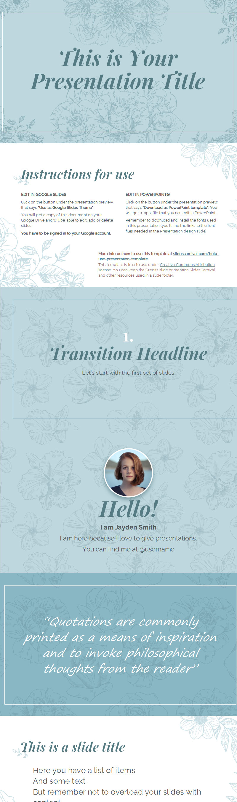 使用这些漂亮的幻灯片在 ppt幻灯片中准备精彩的演示文稿。这个免费模板展示了一种遵循最新趋势的设计,采用柔和的颜色和手绘花朵。标题中使用的衬线字体时尚优雅,布局简约,足以让您的内容大放异彩。您可以编辑主题调色板,将所有幻灯片中的蓝色调更改为粉红色、金色或任何其他颜色。包含可自定义的图标和其他图形,可帮助您强化信息。这个女性主题适合婚礼策划师或制作婚礼请柬,也适用于时装、化妆品、花店等。