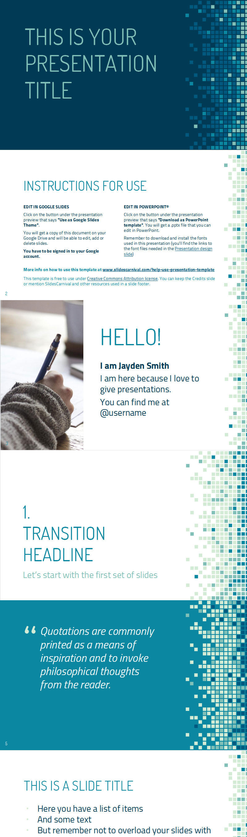 使用这个现成的技术主题模板在几分钟内设计您的 ppt幻灯片演示文稿。这个免费模板有很多幻灯片布局可供选择,并带有巧妙的像素图案,因此您只需用自己的内容更新文本即可。您可以自定义颜色以适合您的品牌,“像素图案”按色调分组,因此您可以进入母版幻灯片并通过单击几下进行更改。用它来谈论咨询、IT、互联网、软件……以及其他与技术相关的话题。有了如此简单的主题设置,您将在几分钟内准备好您的演示文稿!