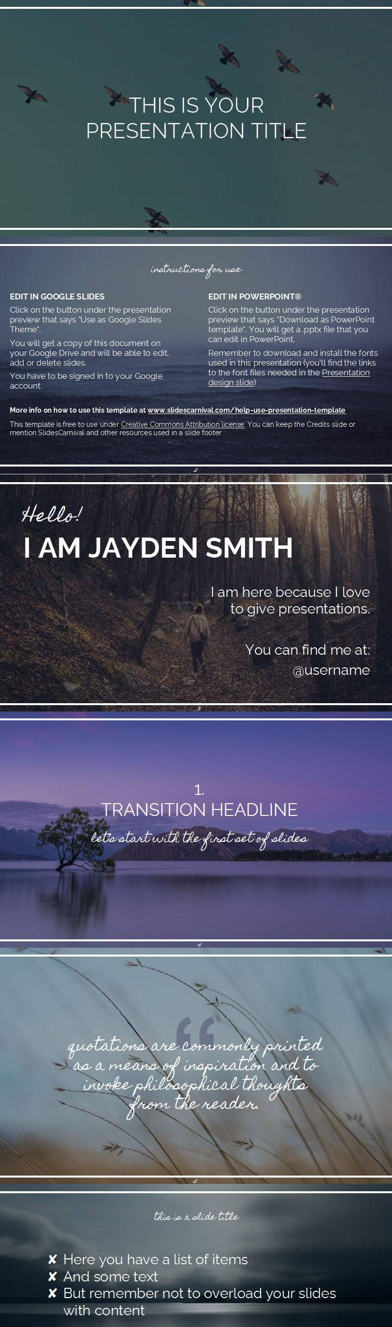 你想激励你的听众吗?那么您应该为 ppt幻灯片使用这个免费模板。凭借其照片背景,它是鼓舞人心的演讲的完美模板,您可以使用提供的照片或上传您自己的照片来改变怀旧情绪。请记住,如果您的幻灯片内容很多,这不是最佳设计