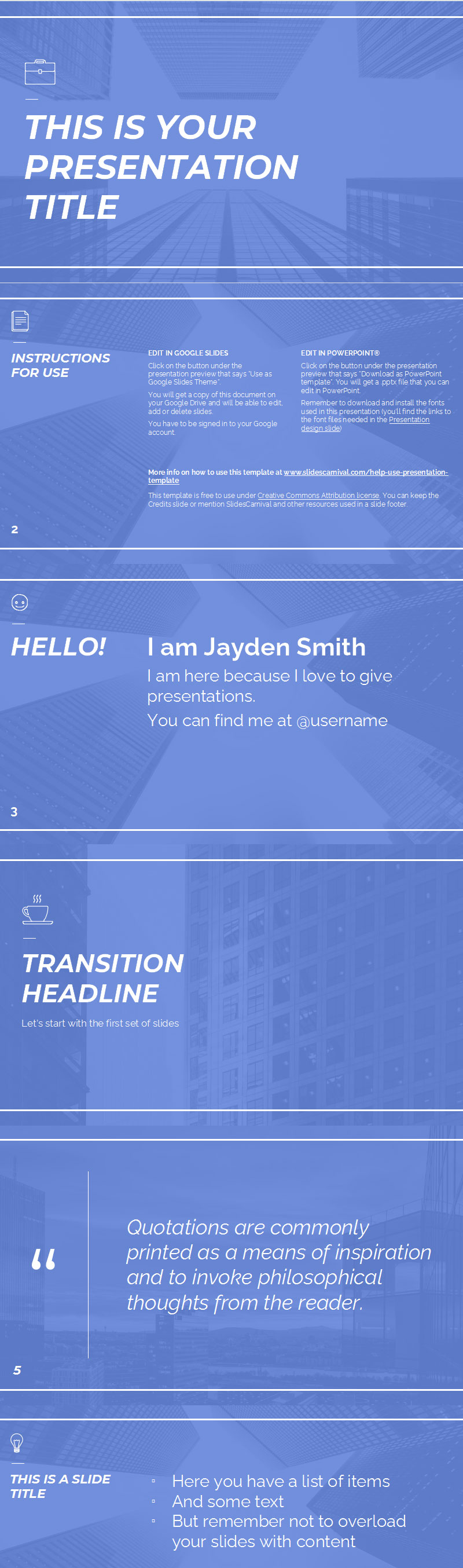 这个免费ppt的演示文稿模板简洁而专业,专为专业和商业主题而设计。使用正式但现代的设计传达您的严肃内容。您可以保留蓝色背景,或为所有与您的品牌相匹配的幻灯片选择一种颜色。更改母版幻灯片中的背景照片,使演示文稿适应您在商务或公司会议中的主题。