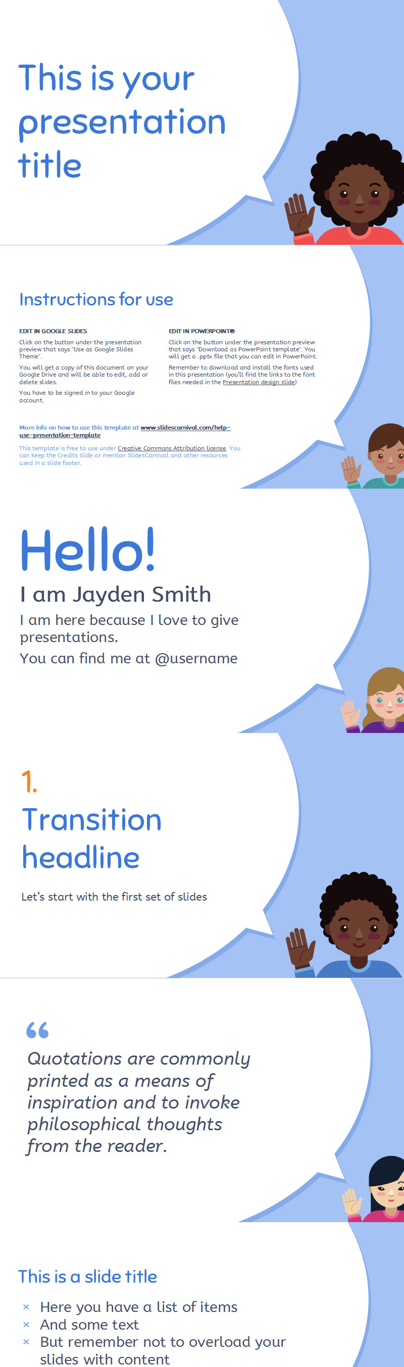 这个免费的ppt演示文稿模板采用欢乐可爱的设计,非常适合吸引年轻(非常非常年轻)观众的注意力。文本气泡传达了一种非正式的风格,并且通过额外的一组儿童插图,您可以选择要呈现每张幻灯片的角色。请注意,此设计不适用于文本较多的演示文稿,因为文本气泡不会为内容留出太多可用空间。但是,在孩子们面前展示教育或多样性相关主题非常好,也适合与儿童打交道的非政府组织。这是一个非常有趣和好玩的模板设计,我相信你会找到合适的场合使用它。