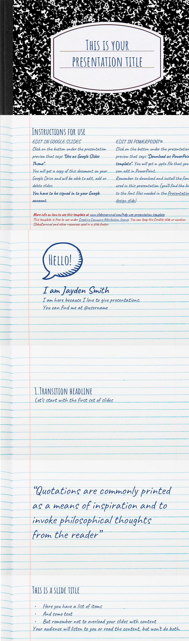 这个免费ppt模板模仿作文笔记本。该设计展示了原始的黑白大理石封面,正面有通用标签,上面写着演示文稿的标题。但是,您可以将幻灯片背景颜色更改为其他封面版本:蓝色、红色、绿色等。将笔记本页面中的内容与手绘图标结合起来,就像一本真正的学校练习册。使用此主题以新颖有趣的方式谈论教育、写作或向您的学生展示练习。