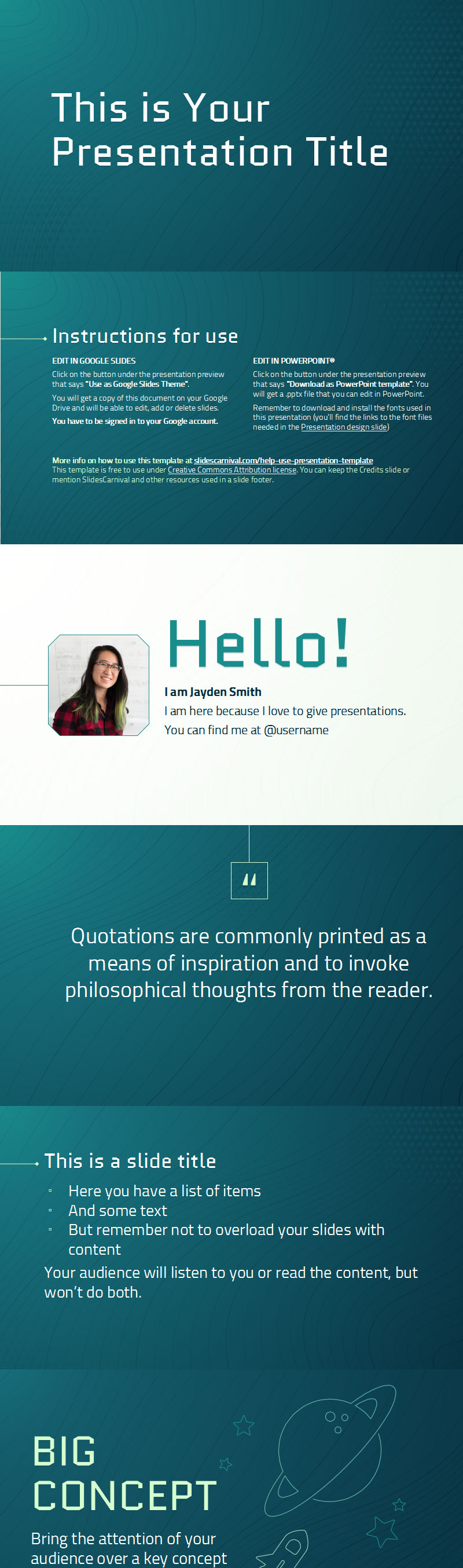 利用这个免费的ppt模板,在您的下一次演讲中保持原创并给您的听众留下深刻印象。此设计具有深绿色的抽象等高线背景。链接到技术风格的字体,它传达了视频游戏的外观。您可以更改背景渐变或主题调色板,轻松将设计转换为其他色调:蓝色、红色、深灰色等。您会发现包含的图标、图形和布局可以直观地显示不同类型的内容。在任何环境中使用它来演示地形、技术、视频游戏甚至军事事务。