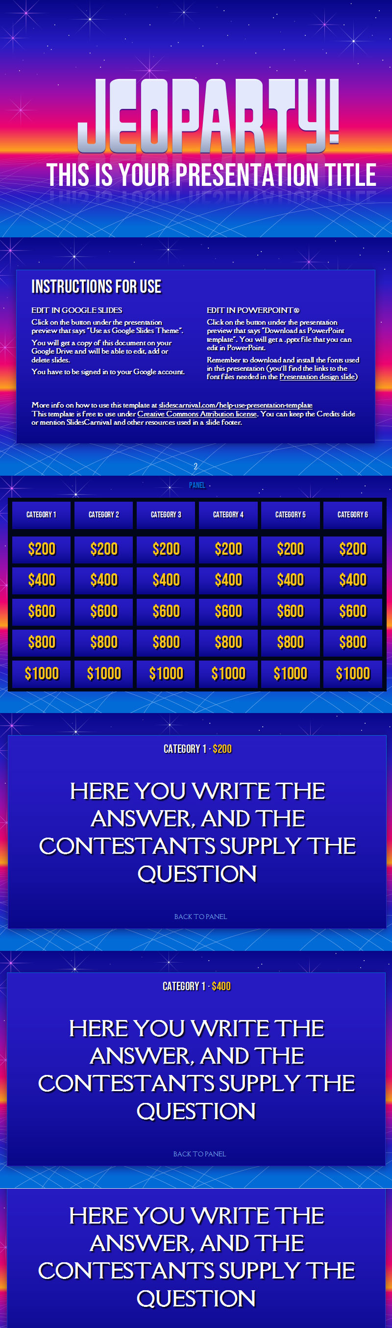 这个危险!交互式模板将帮助您为课堂或朋友聚会创建自定义游戏。危险!是美国电视史上最伟大的节目之一,这种设计模仿了电视节目的外观。此外,它功能强大且非常易于使用,因为它已经是交互式的,单击类别和美元金额将带您进入线索幻灯片。浏览幻灯片并输入您的类别、线索,然后您就可以在课堂、聚会、培训会议等中玩耍了。