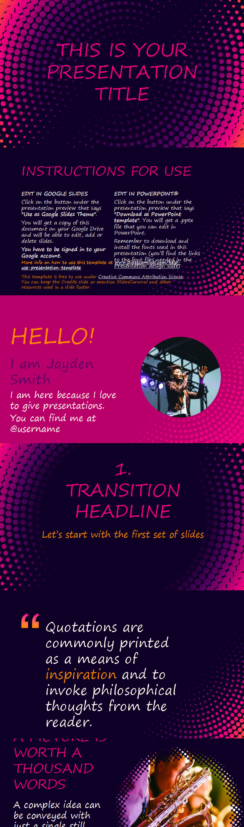 这是一个免费的PPT模板,具有现代设计和鲜艳的色彩。它以暖色调色板中的活泼渐变背景为特色,并饰有半色调图案。通过切换颜色,您可以根据您的企业形象随意调整这个可定制的主题,因为渐变和圆点图案都可以重新着色为任何色调。这种大胆的设计非常适合展示最新趋势、谈论音乐、音乐会或视频游戏。使用这个独特的模板进行演示,给观众留下视觉冲击