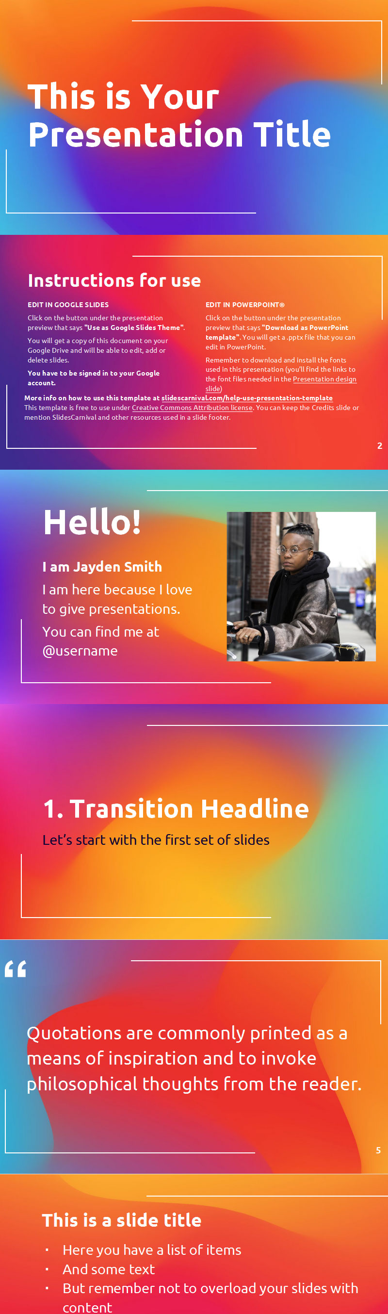 这个免费ppt模板有带抽象渐变的彩色背景。这些幻灯片的背景呈现彩虹渐变,颜色以抽象和有机的方式自由混合。使用彩色照片以获得更大胆的外观,或者如果您想让演示文稿适合您的品牌,则将背景渐变更改为其他颜色。选择这个新鲜的主题来改善您的套牌并在几分钟内制作出有影响力的演示文稿。凭借其原创的外观和颜色,非常适合谈论 LGTB+、创意、艺术或音乐节。