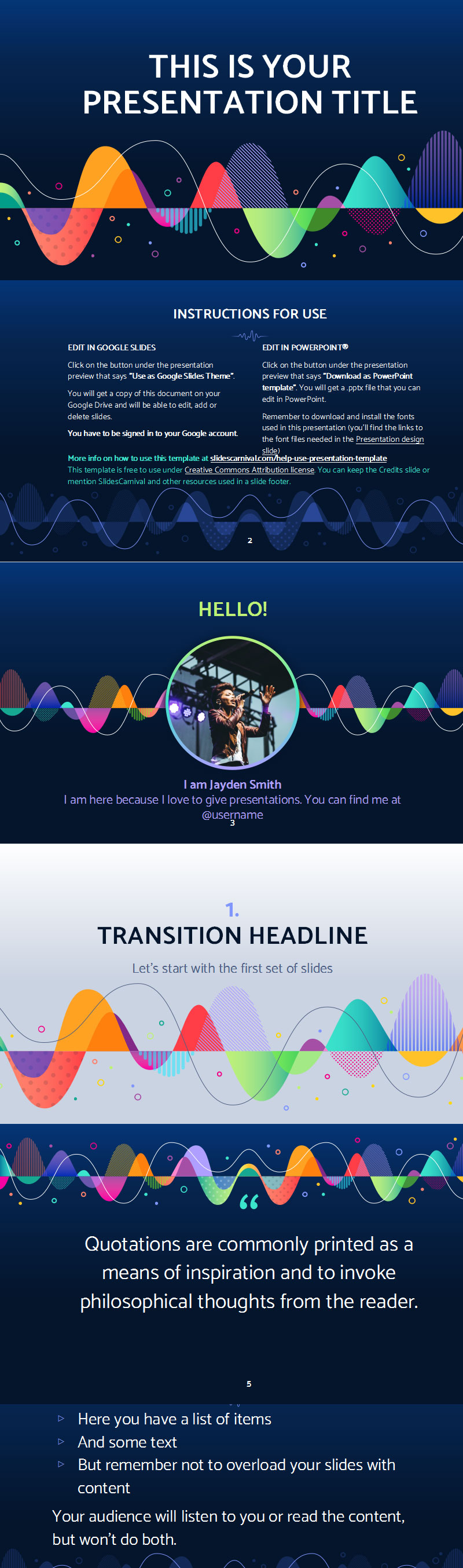 使用这个适用于免费PPT模板让您的观众惊叹不已。带有波浪形状的深蓝色背景类似于声波,并为幻灯片赋予活力。它的调色板围绕着充满活力的色调,传达快乐和活力。自定义您的内容中包含的所有布局,并利用包含的资源来增强您的视觉交流。下载此主题以进行有关音乐、节日、声音设计或舞蹈的演示。