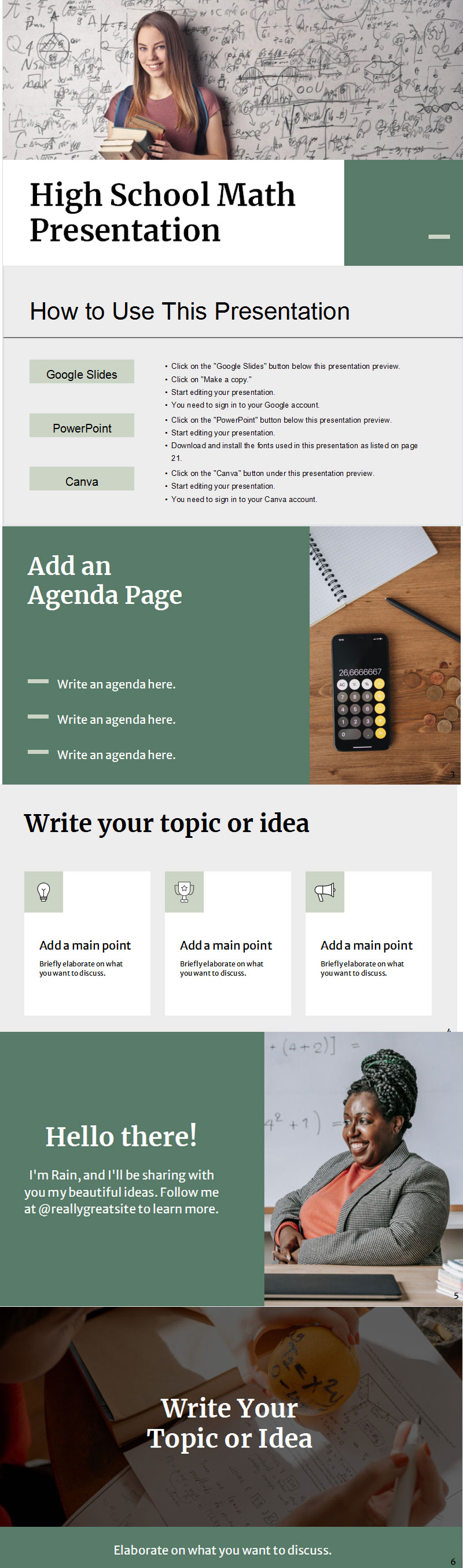 这个绿色、简单、基础的高中数学模板既醒目又易于使用。您会发现一系列经过专业设计的现成幻灯片,其中列出了您要表达的要点,向学生提出问题并包括示例数学问题。创建图表、图形和统计数字。上传图像、照片和插图。为了给您的设计增添些许风情,您可以从方便的图标和元素资源页面中汲取灵感。