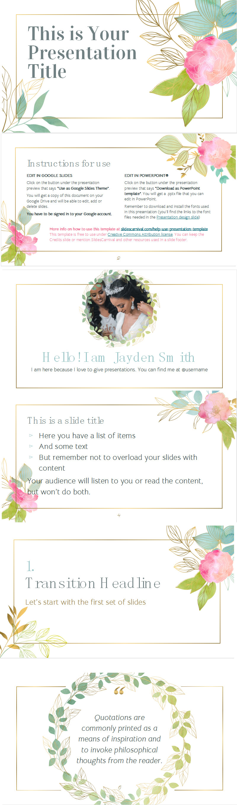 这个免费ppt模板设计优雅,紧跟最新潮流,带有手绘花朵、金色细节和水彩纹理。幻灯片中使用的字体很时尚,最小的布局将使您的内容大放异彩。您会发现可自定义的图标和其他图形包括在内,它们将帮助您装饰幻灯片并使您的内容更加直观。这个女性化的主题适合筹划您的婚礼、为派对收集创意或向您的客人发送最好的婚礼照片。您也可以将它用于时装、化妆品、花店等。
