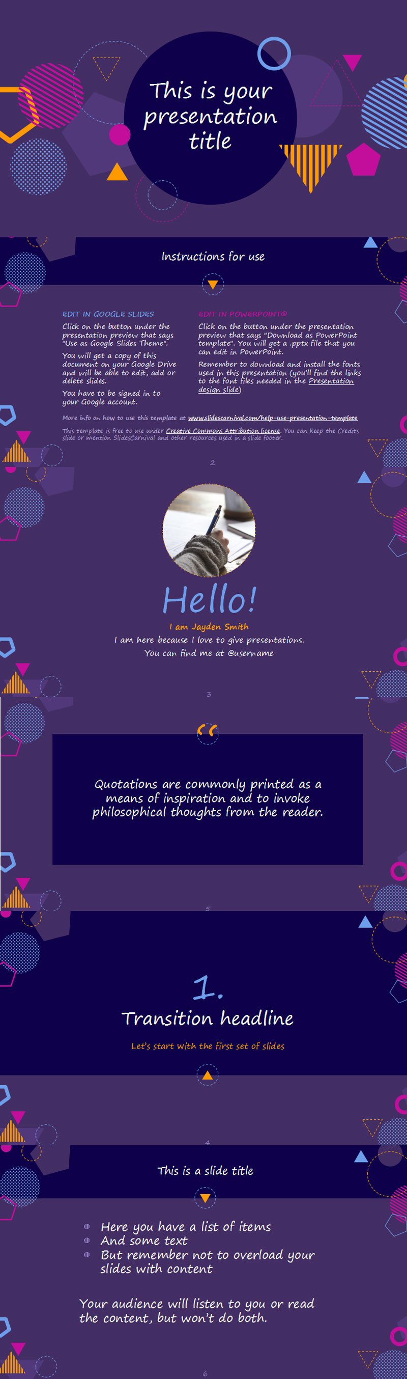 这个免费的PPT模板的特点是非常现代和令人敬畏的设计。紫色背景上的几何图形传达出年轻动感的外观。请注意,使其适应现有品牌几乎是不可能的(尽管所有元素、形状、照片和幻灯片都是可定制的)。但敢于使用它,你会留下印记,让你的信息在人群中脱颖而出。这是一个很好的幻灯片主题,可以谈论潮流、节日、音乐、视频游戏……但如果你想在数学、科学或技术演示中获得乐趣,也可以这样做