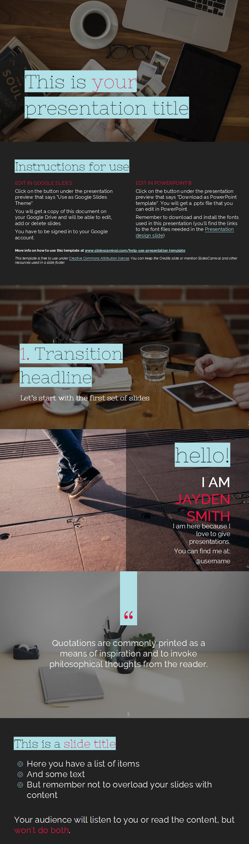 使用您自己的背景图片来支持您 的内容并帮助讲故事,并更改主题调色板以轻松使外观适应您的品牌。如果您需要以视觉方式呈现内容,您会发现其中包含不同的布局和图形元素。这种现代设计使该模板既适用于专业演讲,也适用于创意演讲。