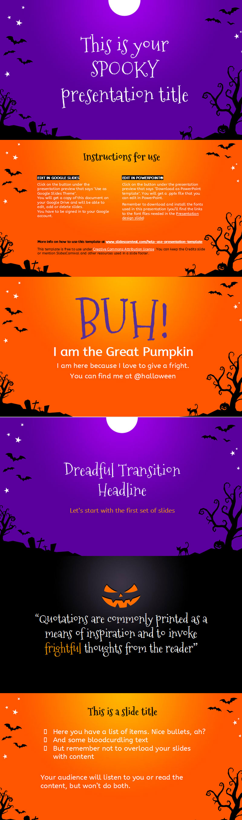 每年我们都会庆祝万圣节,您可以使用这个可在PPT模板来让您的课程和会议充满活力。凭借其紫色和橙色的幻灯片和幽灵般的万圣节景观,它会让每个人都微笑(或颤抖!)。包括南瓜、蝙蝠、死亡树、可怕的坟墓、黑猫和许多恐惧。使用这个特殊的主题发送身着盛装的全家福照片,提出您对社区装饰的想法,或者只是在公司会议上找点乐子。万圣节快乐!