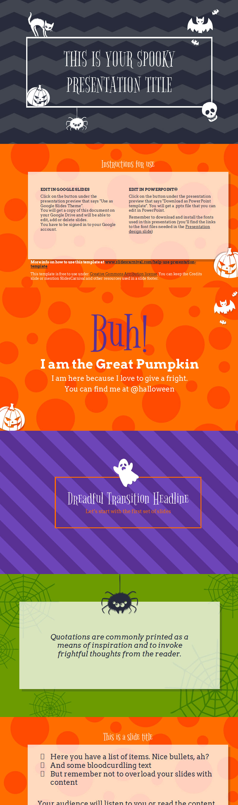 万圣节快到了,您可以使用这个免费的PPT模板来庆祝它。您可以使用这个特殊的主题来发送穿着他们的服装的家庭照片,提出您对装饰教室的想法,或者只是在公司会议上度过愉快的一天。凭借其色彩缤纷的设计和幽灵般的万圣节图标,它会让每个人都微笑(或颤抖!)。包括蝙蝠、蜘蛛、黑猫、南瓜、险恶的头骨和大量可怕的幻灯片创意。万圣节快乐!