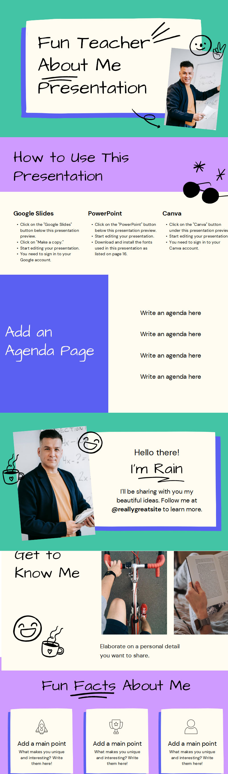这款PPT模板采用紫色、绿色和蓝色,包含您与学生分享自己所需的一切。填写您的爱好和个人兴趣、分享照片和图像以及上传视频或音频剪辑。从图标和元素的资源列表中提取,以帮助美化每个页面。更改配色方案、布局或字体。添加边框、标题或框架。用这种古怪、亲切的设计给人留下最喜欢的老师的印象。