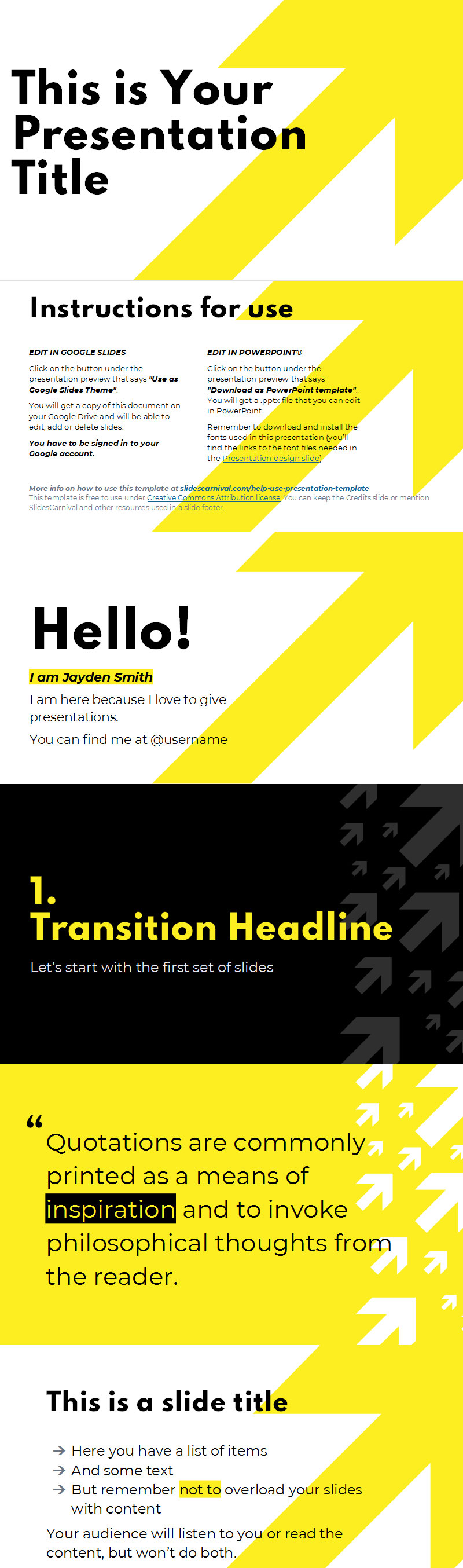 充满活力的黄色箭头上的粗体文本在此模板中组合在一起,形成狂热的现代外观。已经设置好几张幻灯片和布局后,您只需放置内容即可在几分钟内准备好引人注目的演示文稿。
