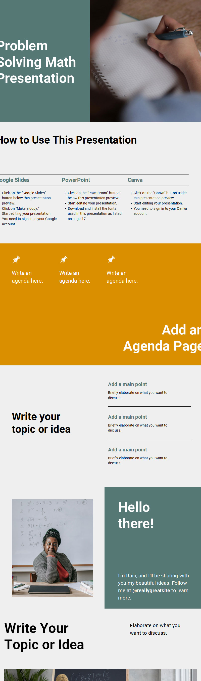这个简单的绿色和黄色问题解决模板包含所有基础知识和更多内容:议程、时间表、统计数字、图形和图表、主题和概念以及大量的图像和文本空间。您可以使用这些幻灯片为下一课、研讨会或课程做准备。只需填写您的详细信息、添加或删除幻灯片并根据需要重新排列布局。您可以保持配色方案和字体组合不变,也可以进行更改。