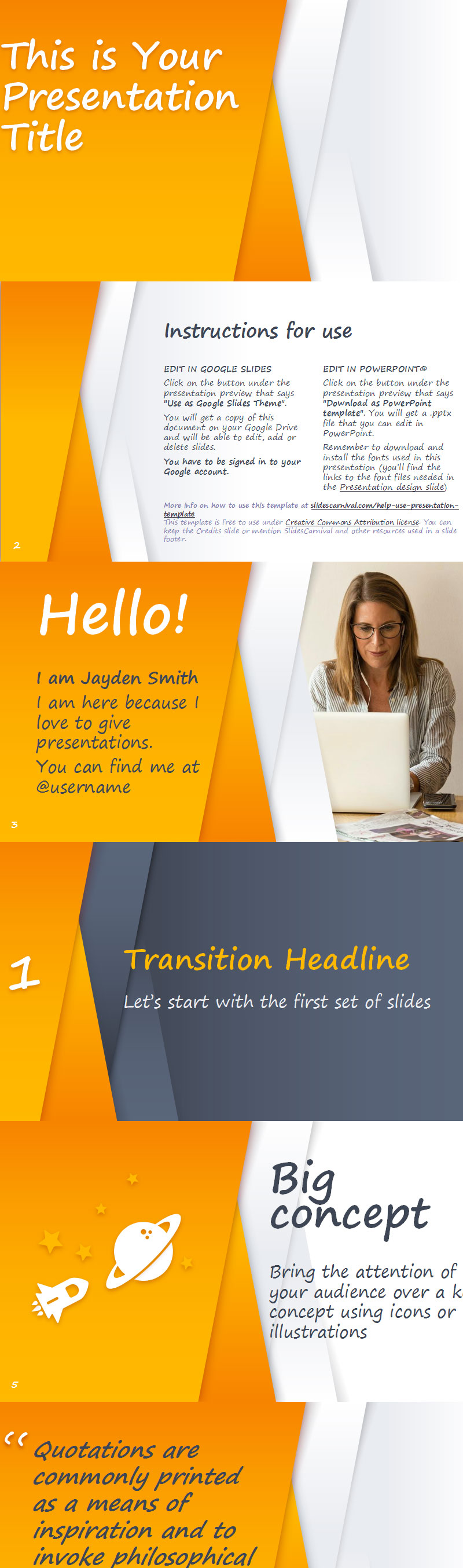 这是一个免费的、优雅的模板,专为在专业环境中使用而设计。您可以在PPT幻灯片中使用它来增强您的演示文稿。倾斜的黄色形状赋予它动感的外观,但最好的部分是您可以轻松更改颜色以适合您的品牌。您还会发现多种布局和资源来支持您的内容。使用此专业主题将您的商务会议和客户演示提升到一个新的水平。
