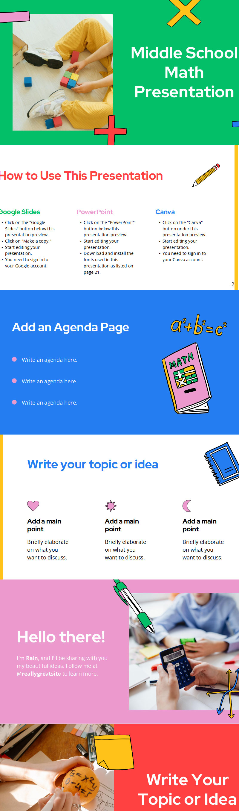 这个明亮欢快的中学数学模板非常适合数学教师寻找一种更具吸引力的方式来计划和展示他们的课程。每张幻灯片上都有说明性涂鸦,此模板使用起来既吸引人又有趣。使用您自己的文本和图像轻松填充页面,添加要涵盖的主题和概念,包括图表和图形,并使用图标和元素用数学符号来说明您的幻灯片。此模板附带一个方便的资源页面,其中包含针对中学生的数学主题元素。