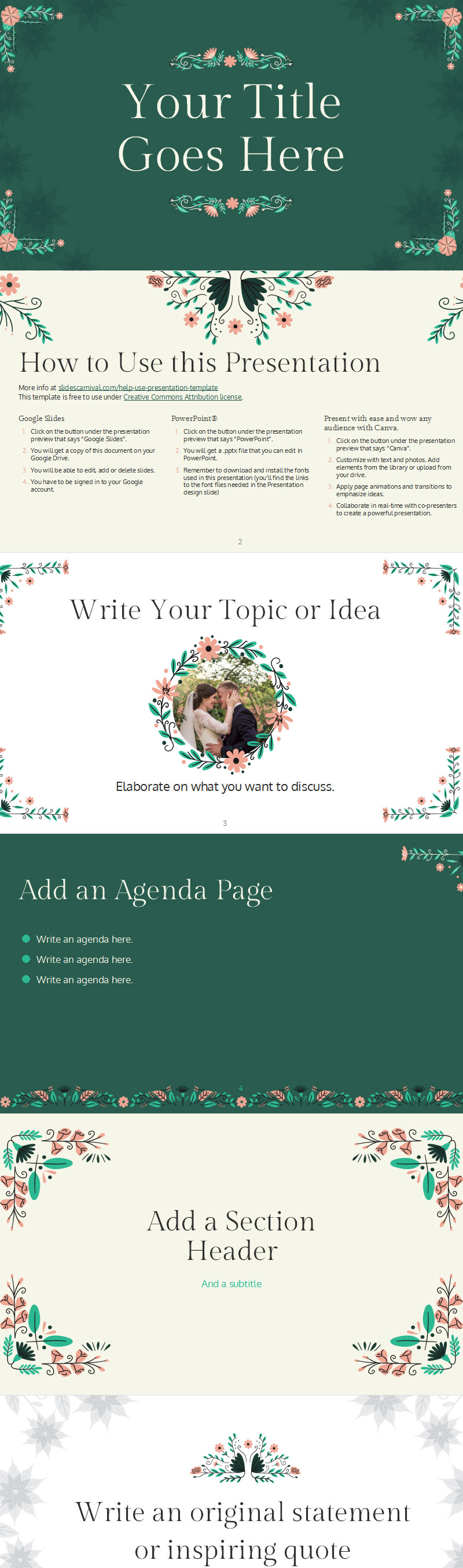 这个免费的演示模板有漂亮的手绘花卉和树叶装饰。该主题采用类似于自然的绿色调色板设计,但所有元素都可以重新着色以适应其他心情。您可以用它来介绍自然、园艺、植物学或有机化妆品。优雅精致的插图也使这款设计适合发送您的婚礼请柬或照片。下次创建演示文稿时使用这个可爱的主题来吸引观众!