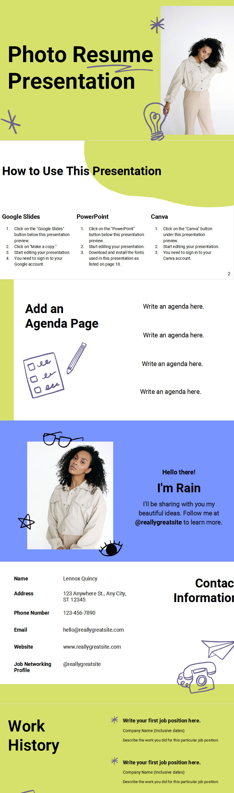 这个绿色和紫色相间的照片简历模板是完全可定制的,可以展示您的背景和创意。填写工作经历、联系信息、教育背景、性格参考、技能和熟练程度等页面。添加时间表、图表和图形、议程、团队成员以及鼓舞人心的引述和陈述。为了保持视觉效果,轻松删除文本框并替换为图像、照片和插图。您会发现大量图标和元素可以从资源页面添加。学习将其用作简历 PPT模板