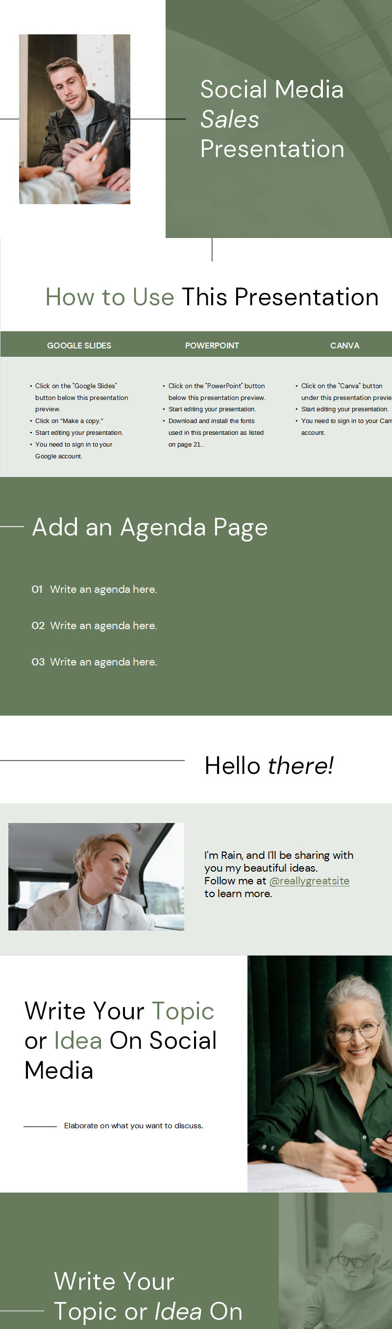 使用这个绿白相间的社交媒体销售模板为您的演讲或研讨会增光添彩。这些幻灯片非常适合创建图表和图形、共享统计数据、展示用户个人资料以及列出重要的想法和主题,这些幻灯片是完全可定制的,可以让您发挥自己的创意。添加图像、插图、视频、照片、图标、元素和其他图形。保持配色方案和字体组合不变或尝试一下。