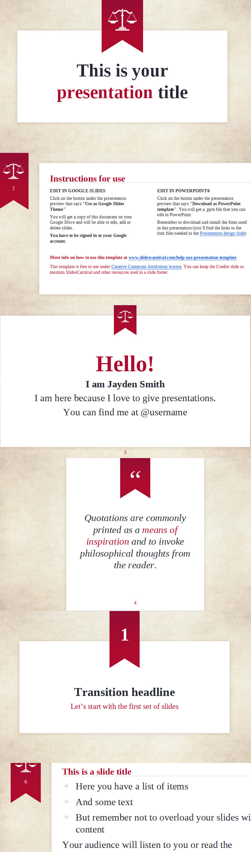 这个免费ppt演示文稿模板的正式和严肃的设计为您的信息提供了可信度,并将赢得您的观众的信任。比例图标使其适用于律师事务所、律师、法律顾问……或者如果您要谈论正义或道德,则可以使您的内容可靠。但是,您可以进入母版幻灯片并更改图标以传达另一个主题:文学书籍、历史沙漏或地理世界地球仪。有无穷无尽的选择!此外,您还可以更改丝带的颜色以使其适应特定的企业形象。此幻灯片主题是您演示文稿内容的完美伴侣。