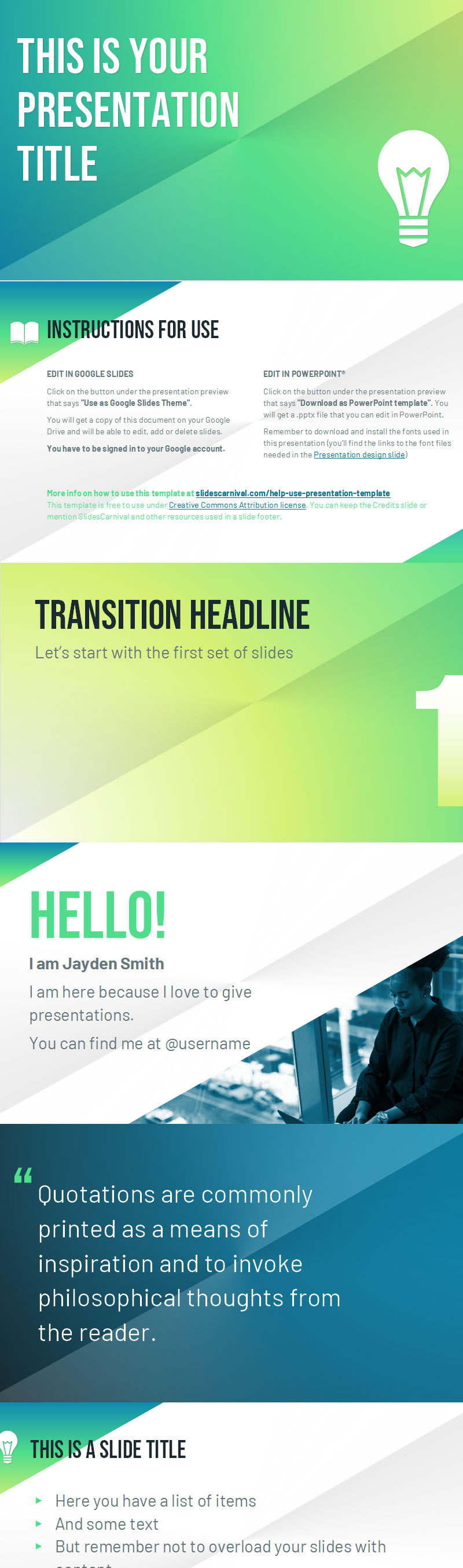 使用这个免费ppt模板,您可以为您的任何 幻灯片演示文稿增添专业气息。幻灯片上的对角线以及充满活力的绿色调为您的内容增添了活力。此外,它经过专门设计,您可以自定义颜色和照片以使其外观适合您的品牌。继续使用包含的图形资源,使您的内容更直观、更易于理解。通过这种一流的设计,让您的观众大吃一惊,并为您的内容增添更多火花。