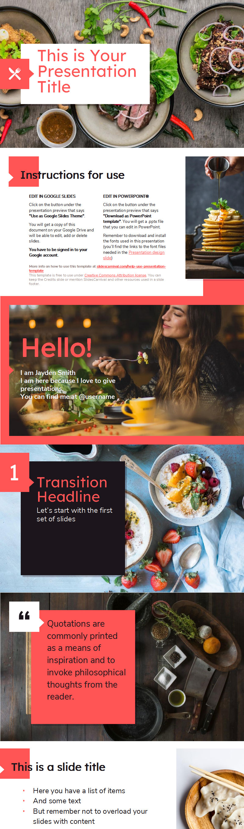 使用此适用于 PowerPoint 和 Google 幻灯片的免费演示文稿模板,让您的企业脱颖而出。这种现代设计具有干净的构图,带有明亮的粉红色强调色和精美的食物照片。但您始终可以编辑颜色和照片以适合任何其他主题。此外,您还会发现可用于说服目标受众的图标和其他图形元素。选择此主题来展示您的餐厅和菜单、饮食和营养计划或食品行业公司的营销活动。祝你胃口好!