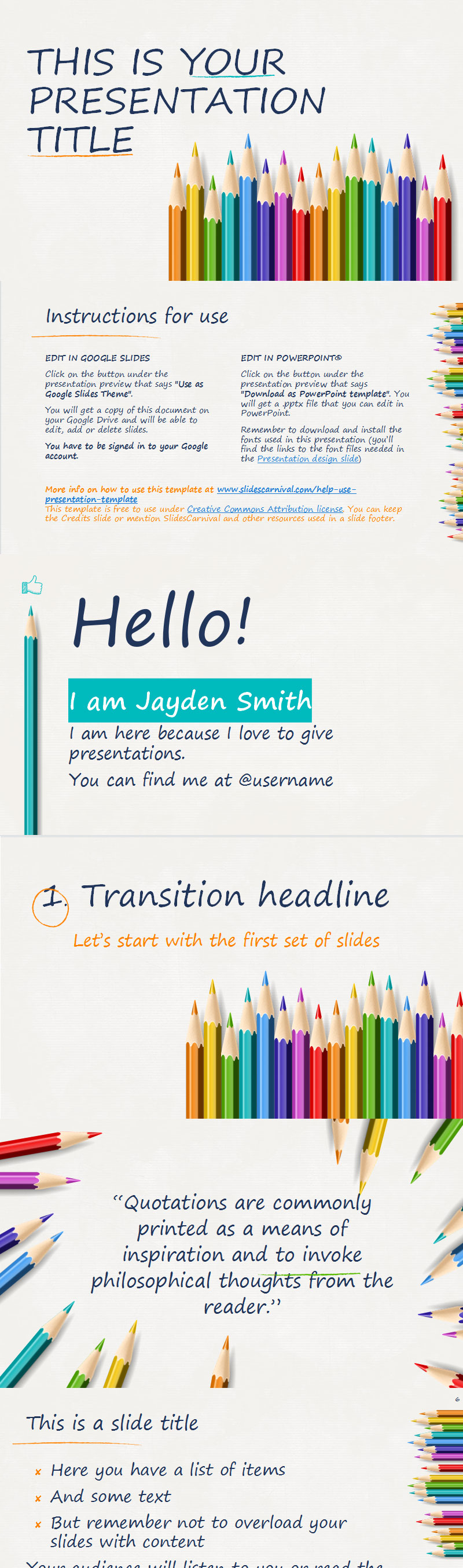 这个生动的 ppt模板采用色彩缤纷的设计,使每张幻灯片都脱颖而出。每张幻灯片上出现的彩色铅笔使这个设计非常适合吸引年幼孩子的注意力。此外,更改全局主题颜色,看看铅笔的色调如何适应!它包含大量布局和视觉资源,可帮助您创建一流的内容,只需编辑文本、添加您自己的图像并使其发挥作用。无论您是学校、学院还是专注于文具和其他学习用品的企业,这个免费ppt模板都将帮助您准备引人入胜的演示文稿。
