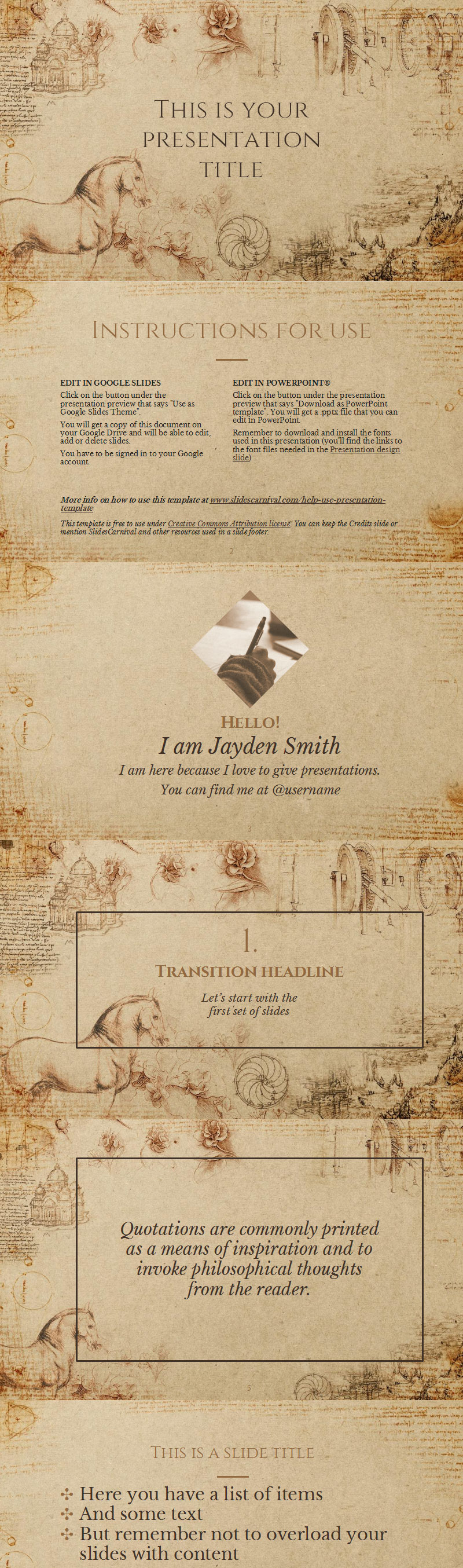 这个免费的演示ppt文稿模板使用纹理纸背景、达芬奇的绘画和经典排版来传达一种历史感。在课堂或会议中使用它来谈论历史、艺术甚至经典文学。让您的听众沉浸在您的主题中,并通过这个漂亮的设计让他们“有心情”。