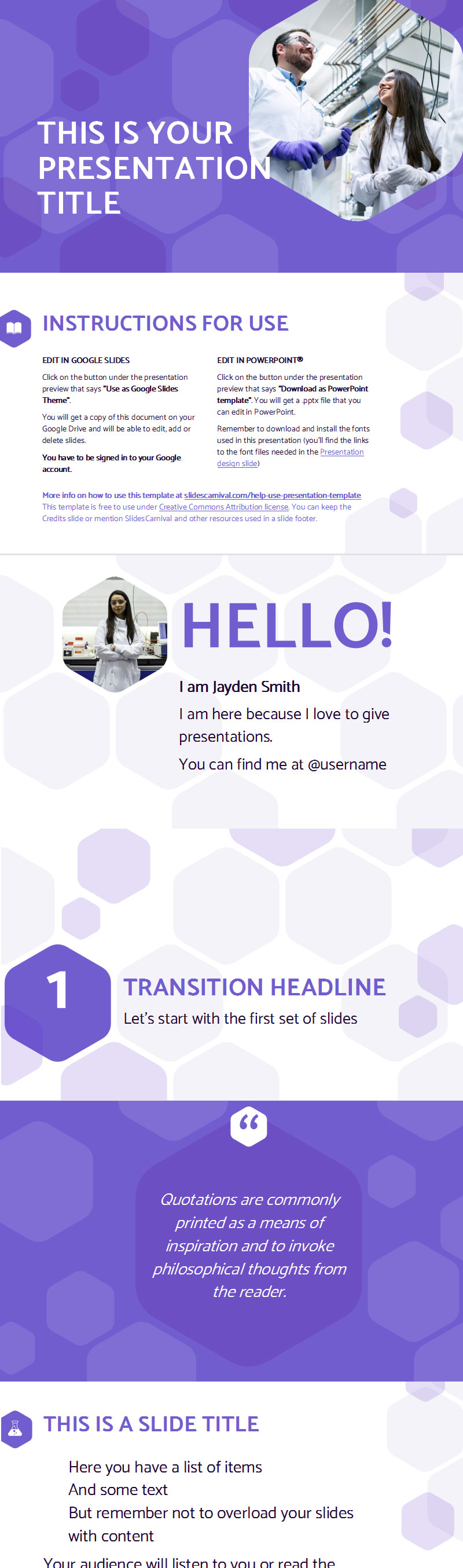 如果您需要准备与科学或技术主题相关的演示文稿,请查看此免费ppt模板。其六边形的专业设计将立即吸引观众的注意力。所有布局都是可定制的,旨在以视觉方式显示您的内容。使用这个多功能主题分享您的愿景、研究成果或您的下一个项目。