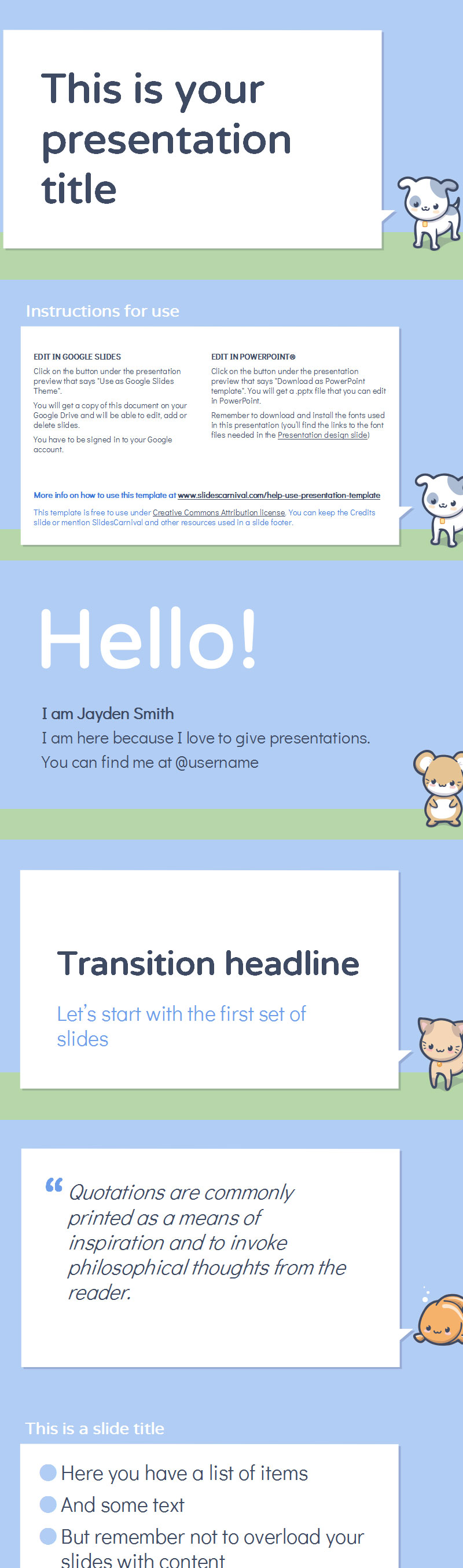 这个免费的ppt演示模板设计可爱,带有宠物插图,非常适合吸引孩子的注意力和取悦他们。文本气泡就好像动物本身在说话一样,如果您进入主幻灯片,您可以更改哪一个(狗、猫、仓鼠或金鱼)将展示每张幻灯片。非常适合在孩子们面前展示,也适合从事拯救宠物工作的非政府组织,但请注意,这种设计不适用于大量文本的展示,因为文本气泡不会为内容留出太多可用空间。这是一个非常有趣和好玩的模板设计,我相信你会找到合适的场合使用它