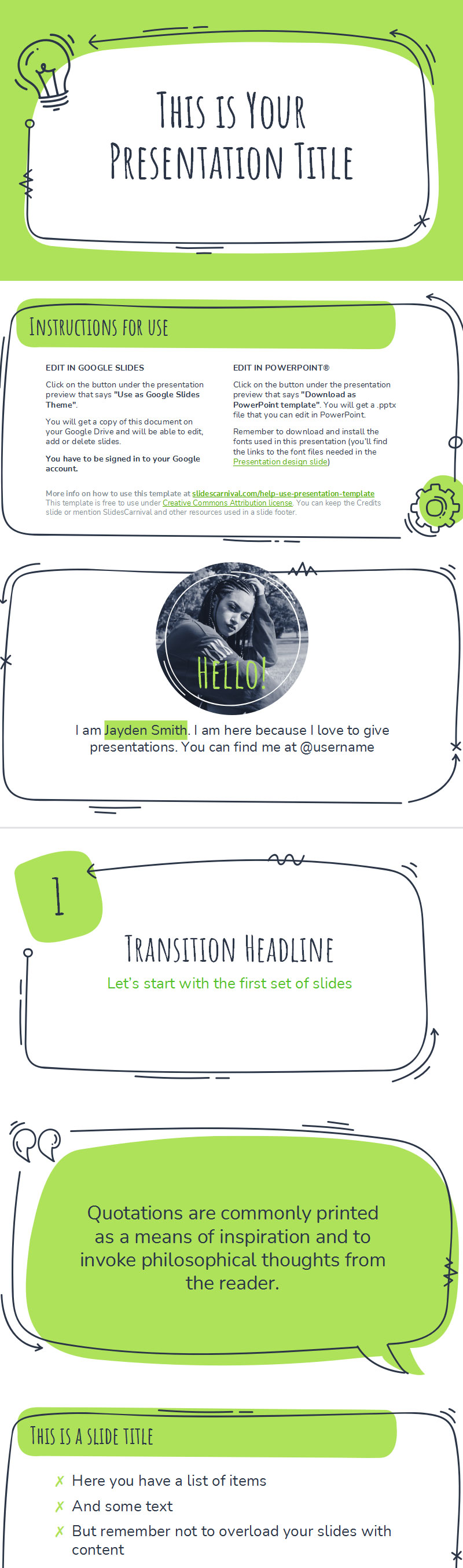 使用视觉技术更好地传达概念的趋势越来越明显,因此这种设计模仿了您在白板上画的那种涂鸦。凭借其手绘草图和明亮的绿色,它将吸引观众的注意力。轻松更改颜色以适合您的品牌,并使用可自定义的图标和不同的布局来突出您的内容。在您的下一课中使用这个多功能主题,展示营销项目或在您的公司举办共同创作研讨会。它会让任何类型的内容大放异彩!