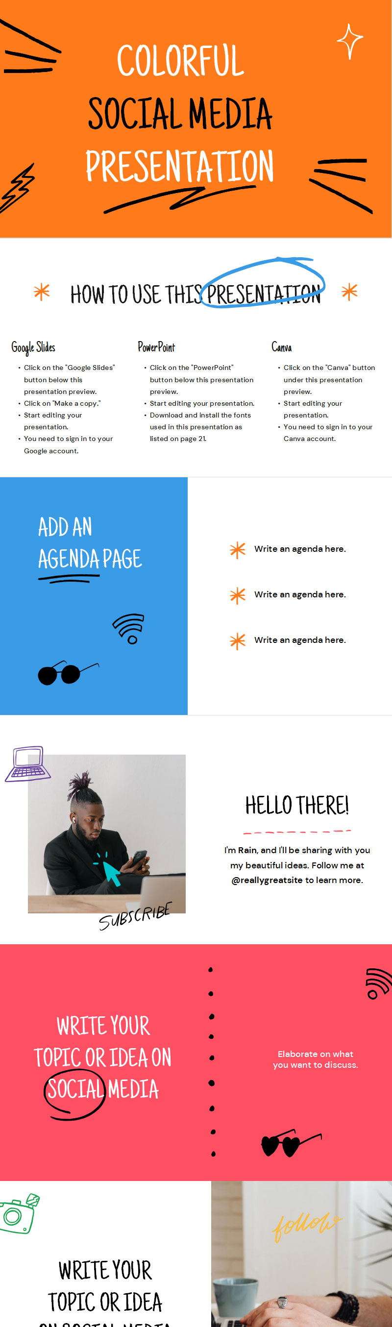 这个丰富多彩的社交媒体模板以有趣的涂鸦和斑点吸引眼球。这些幻灯片经过专业设计和完全可定制,让您以时尚的方式表达自己的观点。填写时间表和议程、主题和想法、示例配置文件和统计数据、图表和图形以及团队成员的页面。您可以轻松地将来自所有社交媒体渠道的信息包含在一张现成的幻灯片中。添加照片、图像和插图。从图标和元素资源页面中汲取灵感。
