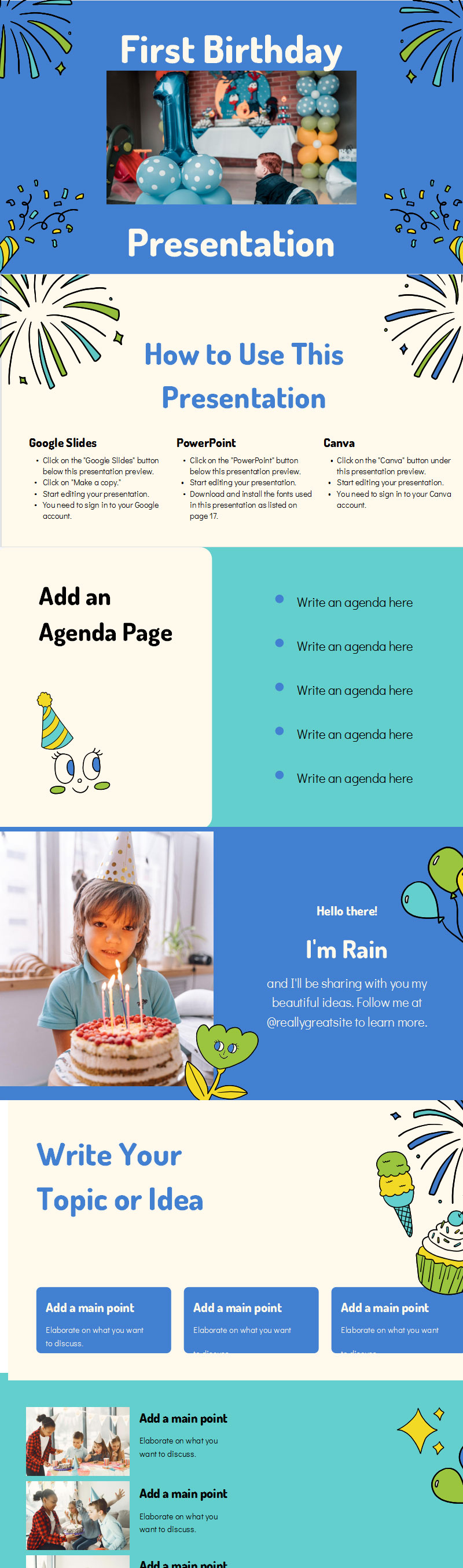 这个迷人的 1岁生日模板包含您计划盛大庆祝活动所需的一切。蓝白背景和欢快的卡通图标,这些幻灯片可以在几分钟内组织成派对计划。您可以添加自己的图像和照片、重新排列图标和元素或完全更改布局。享受方便的图标和元素资源页面,或创建日程表或派对来宾页面。派对结束后,这些幻灯片还可以制作精美的回忆相册。选择您最喜欢的照片,与名言、时间表和其他派对亮点一起展示。